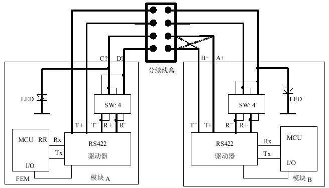 对于MCU的UART来说,无信号传送时,TX引脚为“1”电平,因此,RS422驱动器的A端会为高电平,B端为低电平,此时,在接收模块的A端也应为固定高电平。图2电路中,在一个接收端和GND之间连接一个LED,从而可以据此判断该端是和发送端A相连,还是和发送端B相连,然后通过4位拨码开关SW来人工调整模块总线和接收模块中RS422驱动器接收输入的连接。
