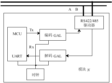 为了在RS422/485网络中实现差分曼彻斯特编码,需要在UART和RS422/485芯片之间增加编码电路。差分曼彻斯特编码属于自同步编码,因此需要时钟。对于工作于异步方式的UART来说,可以使用GAL器件完成编码和解码,但用于控制UART异步传输的波特率时钟和编码电路时钟必须使用同一时钟源。以下给出图4所示的实现框图,具体实现电路这里不再详细叙述。也可以使用专用芯片完成编码和解码,比如采用Echelon公司的FTT-10A收发器。该收发器对信号进行差分曼彻斯特编码调制后传输(同时包含一个隔离变压器)。