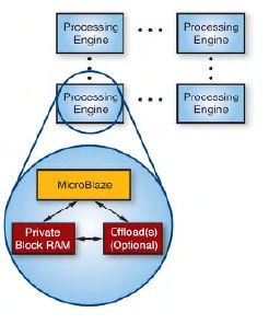图1 - 并行的流水线,每个引擎由一个MicroBlaze处理器、专用存储器和可选的减负器构成。