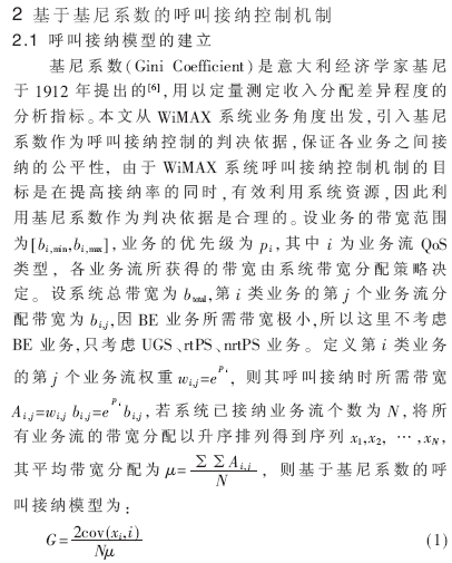 WiMAX无线网络中,呼叫接纳控制机制是保证服务质量QoS(Quality of Service)的关键。目前已有大量的呼叫接纳控制算法被提出,典型的有:利用资源预留机制切换连接请求的截止优先权方式[1]、新连接按概率接纳的分段预留信道方式[2]。资源预留机制以提高低优先级业务拒绝率和降低系统资源利用率为代价,降低高优先级的拒绝率,但设定的预留资源不能很好地适应业务量的实时变化。KIM S等[3]提出的基于本地业务量的预测估计自适应接纳控制算法,不仅复杂度和代价较高,同时依赖于一定的流量模型,具体实施有一定的困难。Fmanuele[4]、Jiongkuan Hou[5]等分别把价格机制引入到呼叫接纳控制机制算法中,有一定的借鉴意义。本文利用经济学概念,提出了一种基于基尼系数作为判决准则的呼叫接纳控制机制,使系统在繁忙时获得最大效率。