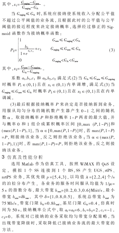 式(1)模型表示呼叫接纳时系统带宽分配的公平程度。因业务流的权重随优先级的增大呈指数增长,而高优先级业务与低优先级业务的带宽要求差距小于其权重之间的差距,模型将在优先接纳高优先级业务的同时提高低优先级业务的接纳率,保证各业务之间接纳的公平性,同时提高系统带宽利用率。