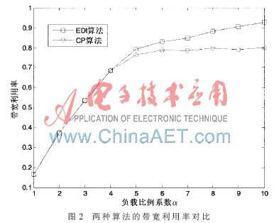 仿真通过调节负载比例系数?琢改变业务的到达率?姿,以此表征系统资源紧张程度。仿真时将典型的截止优先算法(以下简称CP算法)与本文提出的带宽分配公平算法(以下简称EDI算法)做比较。
