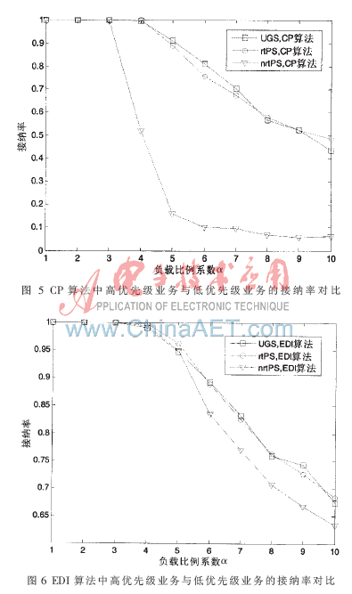 从图3和图4来看,CP算法的UGS、rtPS、nrtPS业务在大负载下,其接纳率均远远小于EDI算法的各业务的接纳率,这是因为CP算法在整个接纳过程中始终为新到业务按照其最大带宽要求预留带宽,并且在已接纳业务的总带宽超过门限时,只接纳高优先级业务而拒绝低优先级业务,大大降低了低优先级业务的接纳率。而EDI算法从每个业务的收入出发,在保证系统带宽分配公平化的原则下,相对CP算法大大提高了低优先级业务的接纳率。在系统资源紧张的时候,又能通过带宽降级,以接纳更多业务,这就使得各类业务的接纳率都能有明显的提升。从图5和图6又可看出,高优先级业务和低优先级业务的接纳率的差距大大缩小了,这是因为EDI算法为了保证接纳的公平性,对能缩小收入差距的业务以较高概率接纳,EDI模型中低优先级业务的带宽是最低的,为了避免带宽分配差距的拉开,EDI算法将限制高优先级业务的接纳率,提高低优先级业务的接纳率,又因为低优先级业务的带宽可调范围大,接纳后可动态压缩其带宽为其他业务服务,可见接纳更多的低优先级业务从带宽分配公平的角度和带宽利用率的角度来看都是有意义的。