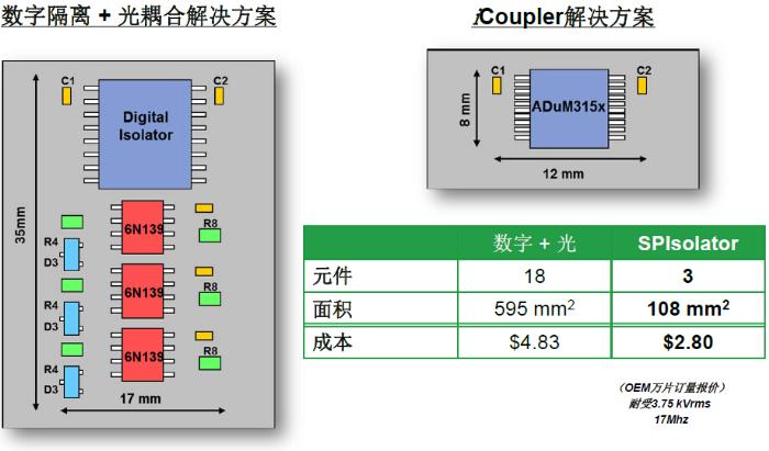 与基于数字隔离+光耦合解决方案相比,高度集成的ADuM315x能够将系统设计中所需元件数量从18个减少至3个,成本只需一半左右。