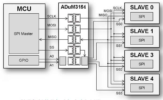 ADuM3154数字隔离器提供从机选择多路复用系统,用一个隔离器最多可以维护4个从机器件。