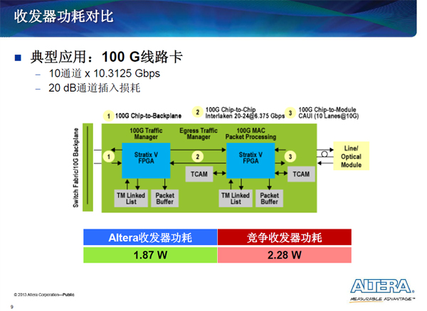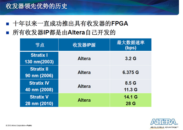 从2003年,Altera在Stratix I 集成3.2Gb/s收发器以来,Altera的所有收发器IP都是自己开发的,Altera通过架构设计专门对收发器功耗做了改进,取得了丰硕的成果。在Stratix V具有28GGb/s芯片至芯片收发器,支持新的CFP2 100GGb/s光模块连接,支持14.1GGb/s背板收发器,应用扩展到数据中心、存储器市场、网络搜索、网络安全领域。