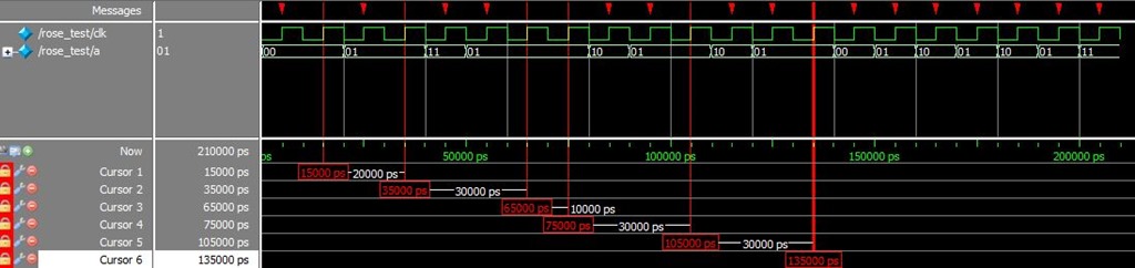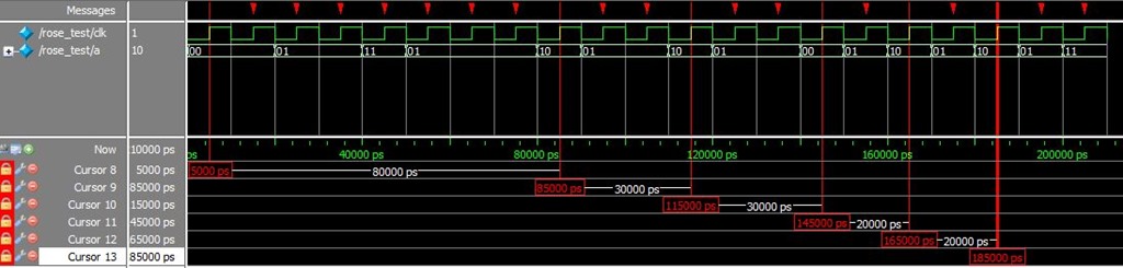 其中,红色光标所在处表示断言成功,而红色下三角表示断言失败。可以很容易分析到,断言成功的地方肯定是当前时刻信号的最低位是高电平,上一时刻信号的最低位是低电平。断言失败的地方信号的最低位要么当前时刻是低电平,上一时刻是高电平,要么当前时刻和上一时刻的电平没有发生变化,不管其他位是如何变化的。从而验证了内嵌函数$rose()只检测信号的最低位,而忽略其他位。