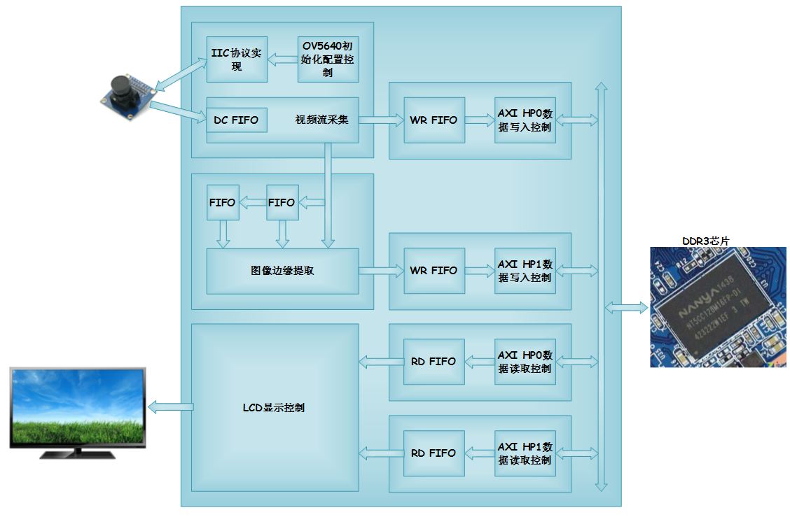 在FPGA内部,采集到的视频数据先通过一个FIFO,将原本25MHz频率下同步的数据流转换到50MHz的频率下。接着将这个数据再送入写DDR3缓存的异步FIFO中,这个FIFO中的数据一旦达到一定数量,就会通过AXI HP0总线写入DDR3中。与此同时,AXI HP0总线也会读取DDR3中缓存的图像数据,缓存到FIFO中,并最终送往LCD驱动模块进行显示。LCD驱动模块不断的发出读图像数据的请求,并驱动液晶显示器显示视频图像。
