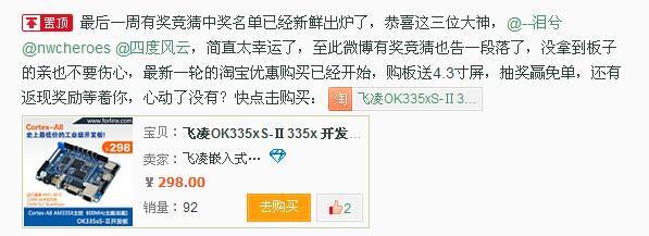 酷暑七月,清凉时刻,飞凌嵌入式OK335xS-II开发板第二波低价风暴开始了,飞凌嵌入式官方微博和淘宝都在举办优惠活动。飞凌OK335xS-II可以说是史上价格最低的工业级开发板仅RMB298,并且还有机会免费拿,更有返现惊喜等着工程师朋友们。让我们看一个微博截图,有图有真相。