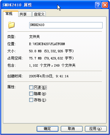 2)、在WINDWOS 2000或者WINDOWS XP中请点击SMDK2410的右键菜单属性,如下图对话框中,去掉“只读”,并点击“确定”按钮。并在新弹出的对话框中选择“将更改应用于文件夹、子文件夹和文件”,并点击“确定”按钮。