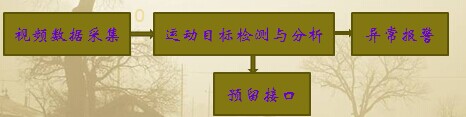 本文所设计的系统通过视频采集设备将视频图像输入到计算机中,使用视频处理算法对分析图像。系统总体上可分为视频采集模块、图像处理模块、异常警报模块三个部分,另外系统还预留了第三方接口,以备扩展之用。各模块之间的关系如图所示。