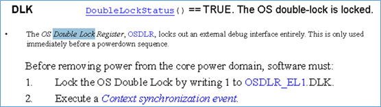 对于DLK,DLK只会在core要进入power down时需要用到的,因为core进入power down,是需要一个序列的,而这个序列是不能被打断的,也就是在执行这个序列时,外部的debugger是不能对core有影响的。此时debugger不能访问ED寄存器,core的halting也是禁止的。