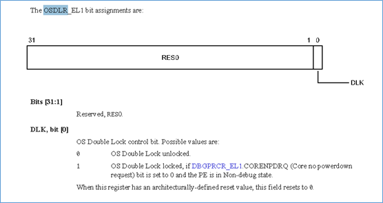 在复位之后,这个DLK为0,表示正常情况下,DLK都为0,即double lock是unlock的。只有当core要进入power down时,就需要软件将这一位置1,表示double lock给lock住。此时core完全禁止debugger对ED寄存器的访问,并且core的external debug功能被禁止掉。