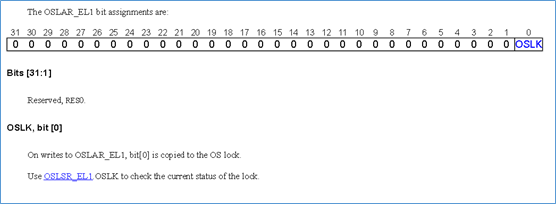 不过OSLSR_EL1是一个只读寄存器,要通过修改OSLAR_EL1寄存器才可以修改OSLK状态。该寄存器是一个只写的寄存器。