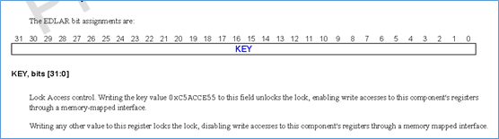 这个是一个只读的寄存器,而修改该寄存器的SLK位,要通过修改EDLAR寄存器(ED寄存器),往这个寄存器写入0xc5acce55,就将software lock给unlock,如果写入其他值,那么就将software lock给lock。
