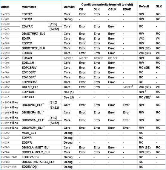 OFF表示core是power down状态还是power up状态。如果要对ED寄存器访问,那肯定是需要core是power up状态的。但是,有一些ED寄存器,在core是power down的情况下,也是可以访问的。