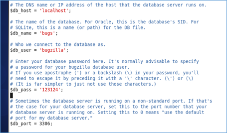 - $db_pass 修改为123124, 之前在mysql中为bugzilla用户设置的密码