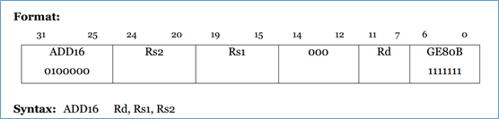 p.add16 rd rs1 rs2 31..25=0x20 14..12=0 6..2=0x1f 1..0=3 |