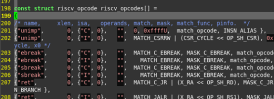 结构体数组,riscv_opodes,保存了riscv的指令。因此要在这个数组中,加入我们自定义的指令,这样才能够实现编译。