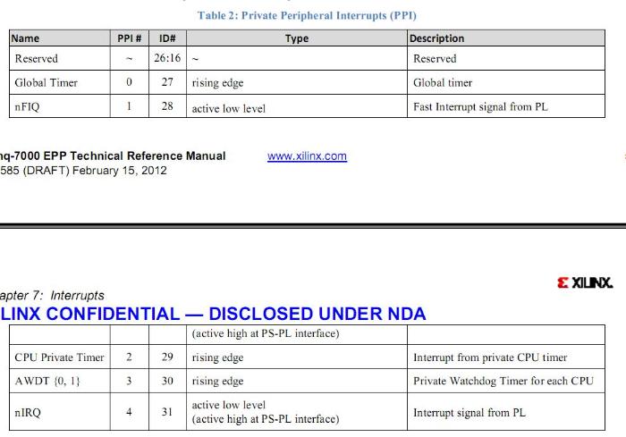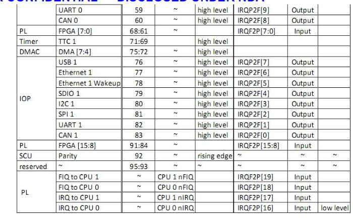 由PS和PL上的各种I/O控制器和存储器控制器产生,这些中断信号会被路由到CPU。PS的外设产生的SPI中断也会路由到PL上。默认地,所有共享外设中断类型在复位时是高电平,然后软件使用的ICDICFR2和ICDICFR5寄存器编程中断32,33和92为上升沿敏感。