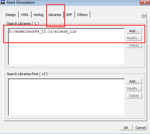 4.然后和之前不同的是,我们需要添加altera的仿真库,因为不同的器件的门延时不同,网表和器件有关。