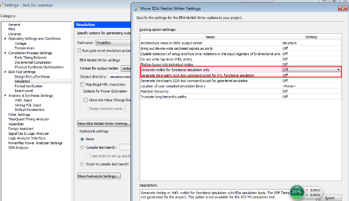 2.在综合后的仿真,我们有一个设置为on,现在我们改为off,这样,除了生成网表vo文件,还会生成布局布线后的延时文件sdo文件