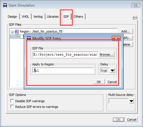 和综合仿真多了一个地方,就是sdf那里添加sdo文件,apply to Region那里是testbench的例化的文件,我例化为u1