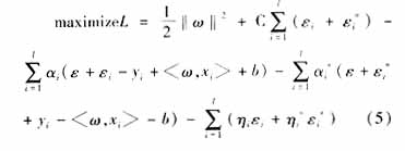 式中C为常数,是回归精度超过允许值的惩罚因子。(4)为有条件约束的优化问题,根据非线性规划对偶性理论,对其建立没有约束条件的Lagrange方程,并将最小值问题它转化为对偶的最大值问题: