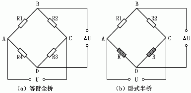 电阻应变片组成的电桥如图2所示。a)图为等臂全桥电路,b)图为卧式半桥电路。