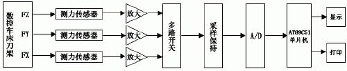 把数控车床切削过程中由传感器变换后的各路的电信号与A/D相连,以便进行A/D转换,这样既可节省设备,又不至于使各个被测参数之间互相竞争。多路开关每次闭合的通道号由程序控制。