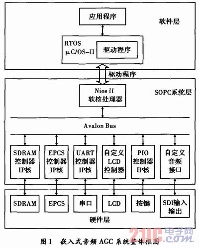 在系统结构上数字音频AGC系统的设计主要包括3个层面:最底层是硬件层面,即物理硬件电路的原理图设计,包括各功能IC的外围电路设计;中间层是SOPC系统层,其设计主要有NiosⅡ软核处理器的配置和添加,选择各种可定制的外设IP核和自定义所需模块,将定制好的各个外设模块与Avalon总线进行连接,并为分配外设地址及中断,最后经编译、综合生成可在FPGA内实现相应功能的SOPC系统模块;最上层的是软件层,主要是NiosⅡ软核处理器运行的软件程序,是用C/C++代码编写的,包括μC/OS-Ⅱ实时操作系统,设备的驱动程序和应用程序。
