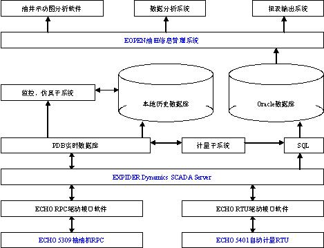 应用软件的核心是安控公司的ESPIDER SCADA 软件,完成数据采集、数据处理、监控、报警管理等功能。油田现场采用安控ECHO5000系列RTU、RPC,所以应选用安控公司自行开发的RPC、RTU接口驱动软件。ECHO监控仿真软件,实现RPC、RTU的远程异地小键盘操作和示功图采集等功能。ECHO油田管理系统软件对整个SCADA系统的数据提供了安全、详细的数据库管理。ECHO油井示功图分析软件" title="分析软件">分析软件根据采集的示功图数据能够对抽油井的工作状态做出准确的分析,并输出专家报告和图形。