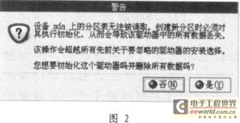 依提示选择完安装语言、键盘、鼠标、安装类型(与Windows类似,此处不再详述)后进入磁盘分区界面,出现如图2所示警告,既然是在虚拟机上进行的操作,此处大胆地选“是”就可以。