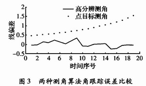 下面以某导引头雷达对某飞机跟踪过程为例仿真,信号和目标参数如上,跟踪距离为390~210 m,目标在水平面内做匀速运动,目标上有4个强散射点。图3是分别采用点目标测角算法与高分辨测角算法得到的跟踪角度与目标真实角度值偏差比较,可以看出后者的误差远小于前者,已经处于目标尺寸范围之内。