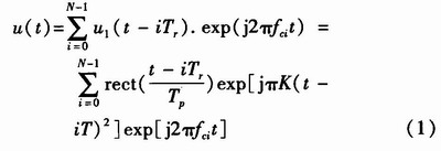 为基带线性调频子脉冲;线性调频子脉冲个数为N;Tr为子脉冲重复周期;Tp为时宽;子脉冲带宽BN=B/N;调频斜率K=BN/Tp。相邻子脉冲间的载频增量为△f;第一个子脉冲的中心频率为fo;则第i个子脉冲的中心频率为fci=fo+iBN;其中i=0,1,2,…,N-1。