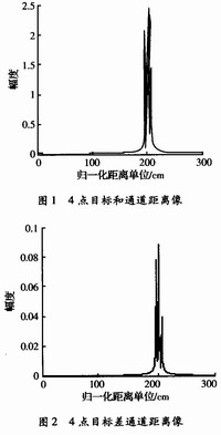 为了验证算法的有效性,设目标上有4个强散射中心,信号参数:带宽B=200 MHz,初始频率fo=60 MHz,脉冲个数N=20。目标参数:ri是第i个散射中心与雷达的相对径向距离,r=[196,198,200,202],单位:cm,θi是第i个散射中心相对雷达视线的方位角,θ=[0.0410,-0.010 2,0.019 0,-0.050],单位:弧度,所有散射点散射强度均相等均为1。根据以上一维成像算法可以得到目标和通道、差通道距离像分别如图1和图2所示。采用高分辨距离像测角算法测量的角度θ=[0.042 0,-0.014 2,0.020,-0.056],从以上可以看出测的目标角度与实际目标散射中心的角度是相当吻合,均匀加权后得到目标径向几何中心的方位角θ=-2.05×10-3。