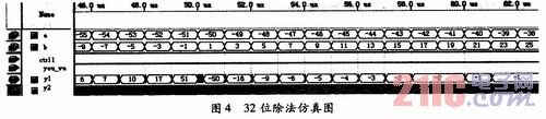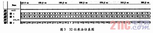 比较好的带符号数的乘法是布斯(Booth)算法。但是本模块既要实现有符号数运算,也要实现无符号数运算,用Booth算法反而复杂。综合考虑逻辑资源的使用和速度两个方面的因素,本设计采用下面的算法:不管是有符号数还是无符号数乘法,都转换成无符号数相乘,最后根据需要对计算结果进行转换。如果是无符号数相乘,乘积不作变化。如果是有符号数相乘,只有两位乘数符号不一样时才对乘的结果做处理,否则结果不变。乘积处理的方法是将乘积取反加1。假设乘数是32位数a,b,乘法主要通过移位和加法组成,设a=a31,a30…a0,如果ai=1则b向左移i位且右边添i个0,否则b不作变化,a中有多少个1就要进行多少次移位操作,最后将所有移位值相加既得a×b的值。乘法的仿真图如图3所示。仿真结果表示设计完全正确。32位有符号和无符号数乘法模块占用逻辑资源不到800 LE,且由于各种移位并发进行,故速度较快。