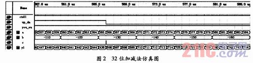 加减法模块可根据需要完成32位有符号数和无符号数的加减运算,在程序开始时先判断所要进行的运算有无符号数,对于有符号数,用符号位将两组数扩展为33位二进制数,否则用0扩展为33位二进制数,其中减法运算采用补码实现,所以整个程序只有加法运算。程序只占用68个逻辑资源(LE),非常节省资源,而且速度很快,是一种优化设计。仿真图如图2所示。