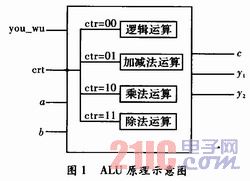 总体设计图,如图1所示。当you_wu=1时实现有符号数加减乘除运算,否则为无符号数运算。进行有符号数加减运算时c为符号位,无符号数加减运算时c表示进位或借位。加减法运算和逻辑运算结果存于y1。乘运算时,y1放高32位,y2放低32位。除法运算时y1放商,y2放余数。a,b表示两路32位输入数据。