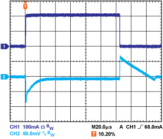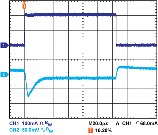 输出电容还会影响调节器对负载电流变化的响应。控制环路的大信号带宽有限,因此输出电容必须提供快速瞬变所需的大多数负载电流。当负载电流以500 mA/µs的速率从1 mA变为200 mA时,1µF电容无法提供足够的电流,因而产生大约80 mV的负载瞬态,如图1所示。当电容增加到10 µF时,负载瞬态会降至约70 mV,如图2所示。当输出电容再次增加并达到20 µF时,调节器控制环路可进行跟踪,主动降低负载瞬态,如图3所示。这些示例都采用线性调节器ADP151,其输入和输出电压分别为5 V和3.3 V。