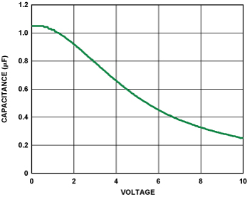 本例中,X5R电介质在–40°C至+85°C范围内的TVAR为15%;TOL为10%;CBIAS在1.8 V时为0.94 μF,如图4所示。将这些值代入公式1, 即可得出:CEFF = 0.94 μF × (1 – 0.15) × (1 – 0.1) = 0.719 μF