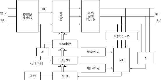 8031单片机最小系统及少量的扩展外围芯片和SA8282三相PWM产生器构成本系统控制电路。单片机除完成SA8282的初始化、输出脉宽控制、频率控制外,同时完成开环、闭环控制算法的运算及数据处理,模拟信号与数字信号的检测、保护功能的逻辑判断等。