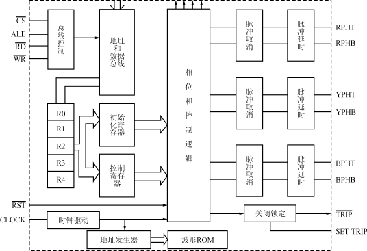 ③输出及控制RPHT、RPHB、YPHT、YPHB、BPHT、BPHB为标准的TTL电平输出端,即PWM驱动信号。TRIP指示输出封锁状态,低电平有效。SETTRIP为关断触发信号输入端。当输入出现高电平时,输出脚TRIP及六个PWM输出将被迅速地锁存在低电平状态,这种封锁信号只有在RST信号作用下才能解除。