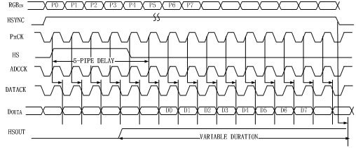 经AD9883转换后,数字视频信号输出的时序如图4所示。在数据输出时钟DATACK的下降沿对应信号的采样及量化,量化的数据在时钟上升沿稳定的输出;接口电路可在DATACK的上升沿准确地锁存图像数据,从而实现数字化图像的采集。值得注意的是,AD9883有一个数据输出通道,在输出数据有效之前必须清空通道,从而导致每行输出有效数据之前将输出4组无效的数据,可通过行同步信号HSOUT避免输出这些无效数据。
