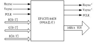 本系统采用EP1C3T144C8将输入的数字化的RGB信号转换为YUV信号,送给DM355的视频采集前端。FPGA以AD9883输出的像素时钟PCLK作为全局同步时钟。