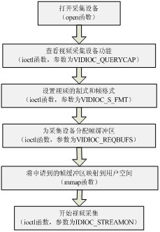 视频采集程序通过调用V4L2[5](Video For Linux 2)来实现,V4L2是Linux中提供的关于视频设备的内核驱动,它为针对视频设备的应用程序变成提供一系列的接口函数,如VIDIOC_REQBUFS,分配内存;VIDIOC_QUERYBUF,将VIDIOC_REQBUFS中分配的数据缓存转换成物理地址;VIDIOC_QUERYCAP,查询采集设备功能;VIDIOC_S_FMT,设置当前驱动的视频捕获格式;VIDIOC_STREAMON,开始视频采集等。