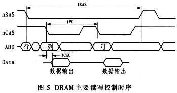 图5是DRAM主要读写控制时序。可以看出,影响所构建FIFO读写速度的主要因素是tPC,这也是决定DRAM速率的关键所在,因此,所构建FIFO的理论速度也应该接近DRAM最高频率。同时,还必须考虑DRAM的刷新操作。这里,系统采用nCAS先于nRAS的方式(CBR),即控制nCS、nCAS、nRAS,并保持nWE为高电平,利用芯片内部计数器决定要被刷新的行。HY57V281620E提供了这种自刷新模式,刷新速率由tREF来决定,通常为64 ms。在系统或某存储块长时间无操作的情况下,需要定时刷新,以保持数据完整。