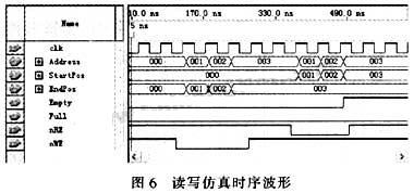 图6是用QuartusIl4.0根据2.3中设立的头尾指针算法设计仿真出来的时序波形。可以看出.系统从0x000底开始写数据,当写入3个数据时。EndPos增加到0x003,再进行3个数据读操作,即StartPos增加到0x003,此时,所构建的FIFO是读空状态,可以看到读空信号Empty在这时变为高电平,达到FIFO设计所需要求。