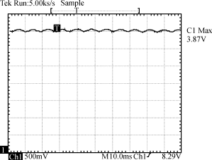 图6给出了功率因数校正器的升压电压波形。变频器的直流母线由交流电网整流后供给。注意120Hz(两倍电网频率)的纹波电压迭加在380VDC之上。这是交流电网电压经功率因数校正之后的结果。