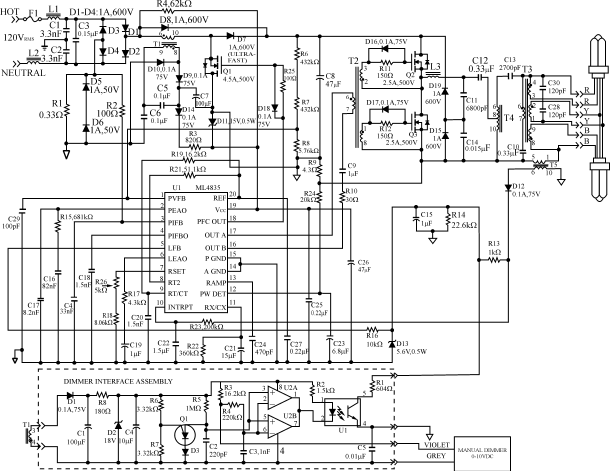 当工作电压超过102V~138V范围时,ML4835EVAL板作为功率因数校正的65W电子镇流器,它接受0~10VDC控制、具有20∶1调光范围,控制两只串接的32WPLT紧密型荧光灯管。灯管采用预热、点亮和调光的运行模式,是一频率变化范围宽、不重迭的变频器拓扑。图1给出了这种120V的电子镇流器设计框图。图2则给出了完整的ML4835EVAL电路图。